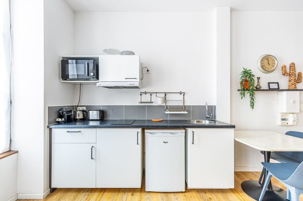 Il se compose : - 1 salon lumineux avec canapé convertible confortable - 1 cuisine équipée - 1 salle de bain avec douche LA CUISINE La cuisine comprend une plaque de cuisson, un frigo, un four micro-onde, un grille-pain, une bouilloire, une machine à café Nespresso. LES ÉQUIPEMENTS Tous les équipements sont fournis : wifi, sèche-cheveux, éponge, sacs poubelle, draps de qualité hôtelière et serviettes fournis, ménage professionnel avant et après chaque réservation. L'appartement n'est pas accessible aux personnes à mobilité réduite.