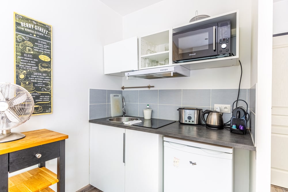 Il se compose : - 1 salon lumineux avec canapé convertible confortable - 1 cuisine équipée - 1 espace dédié aux repas - 1 salle de bain avec douche LA CUISINE La cuisine comprend une plaque de cuisson, un frigo, un four micro-onde, un grille-pain, une bouilloire, une machine à café Nespresso. LES ÉQUIPEMENTS Tous les équipements sont fournis : wifi, sèche-cheveux, éponge, sacs poubelle, draps de qualité hôtelière et serviettes fournis, ménage professionnel avant et après chaque réservation. L'appartement n'est pas accessible aux personnes à mobilité réduite.