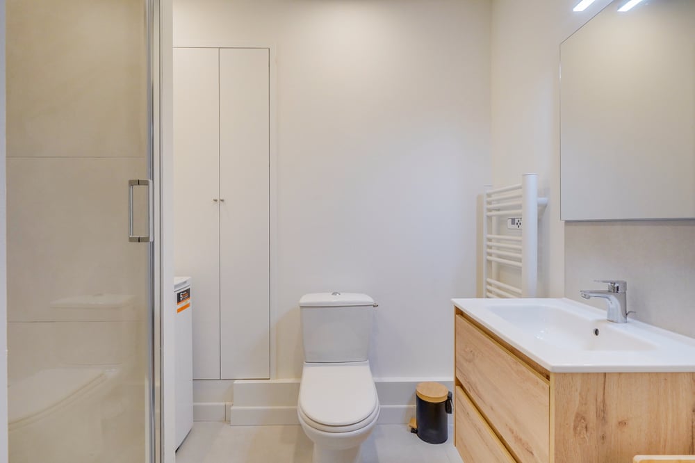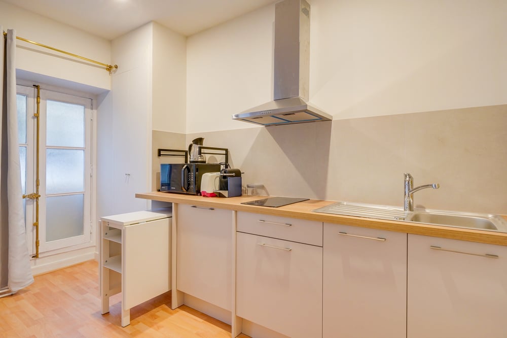 Il comprend : - 1 cuisine entièrement équipée, - 1 espace couchage avec 1 lit double confortable. - 1 salle de bain avec une douche spacieuse, - 1 cabinet toilettes. LA CUISINE La cuisine comprend une plaque de cuisson, un réfrigérateur, un four micro-onde, un grille-pain, une bouilloire et une machine à café Nespresso. LES ÉQUIPEMENTS Tous les équipements sont fournis : climatisation, wifi, sèche-cheveux, lave-linge, dosettes de café, éponge, sacs poubelle, draps de qualité hôtelière et serviettes fournies. Ménage professionnel avant et après chaque réservation.